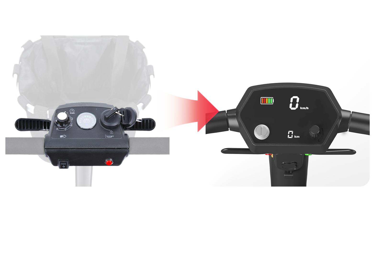 แบตเตอรี่แบบอะนาล็อกและตัวแสดงความเร็วแบบเดิมไม่เหมาะกับผู้ใช้สูงอายุที่มีสายตาไม่ดี เวอร์ชันอัปเกรดมีจอแสดงผลดิจิตอล LED ความละเอียดสูง** ซึ่งแสดงความเร็วปัจจุบัน แบตเตอรี่ที่เหลืออยู่ และโหมดการขับขี่แบบเรียลไทม์ได้อย่างแม่นยำ ระดับแบตเตอรี่จะระบุอย่างชัดเจนด้วยสีสามสี: สีเขียว สีเหลือง และสีแดง ช่วยให้มองเห็นเตือนให้ชาร์จเมื่อแบตเตอรี่เหลือน้อย การแสดงความเร็วมีความแม่นยำถึง 0.1 กม./ชม. และด้วยปุ่มปรับความเร็ว (ปรับได้ตั้งแต่ 2 ถึง 8 กม./ชม.) ผู้ใช้จะสามารถควบคุมจังหวะการขับขี่ได้แม่นยำยิ่งขึ้น หลีกเลี่ยงความรู้สึกไม่สบายจากความผันผวนของความเร็ว
